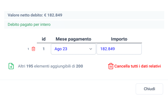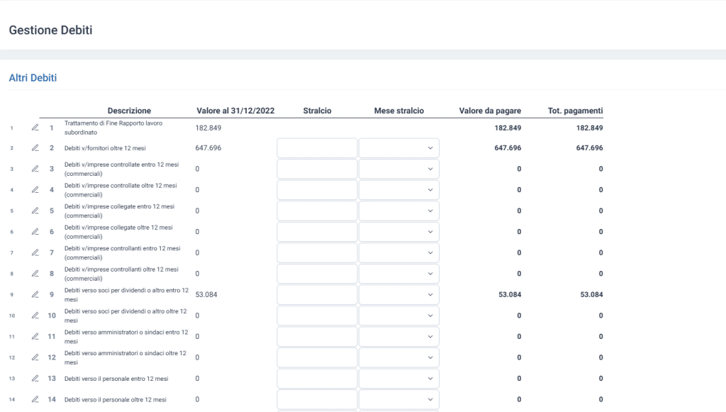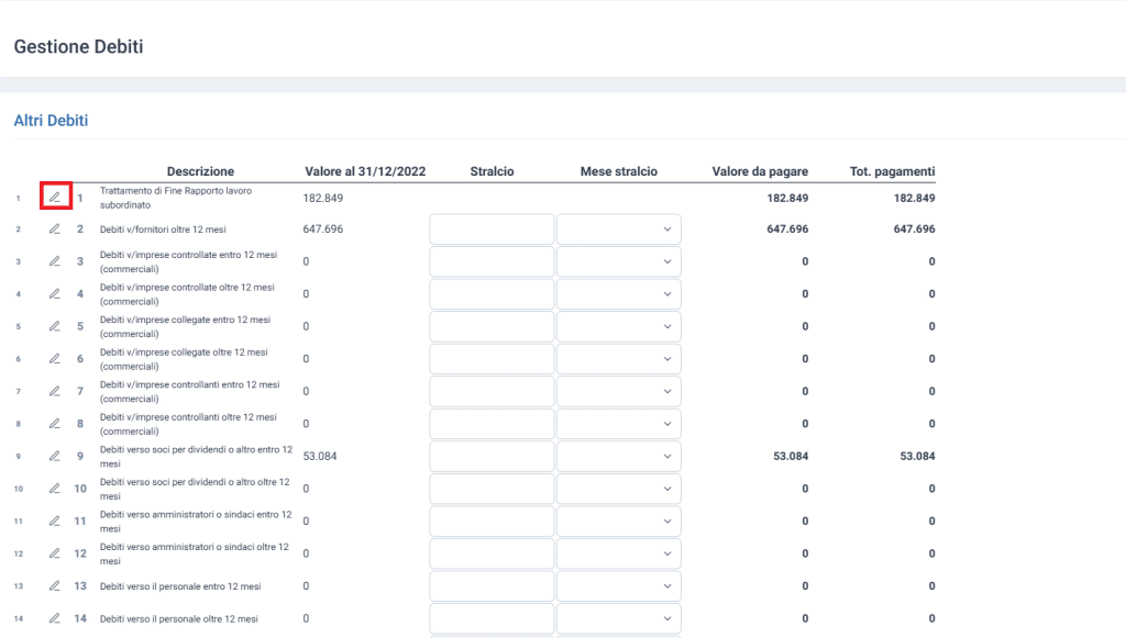 Anche in questo caso, per ciascuno dei debiti inseriti bisogna infine definire il prospetto dei pagamenti indicando i mesi in cui questi ultimi verranno rimborsati ed i relativi importi versati (Iva inclusa), per fare ciò sarà necessario cliccare sul simbolo della matita in corrispondenza di ciascuna riga.
