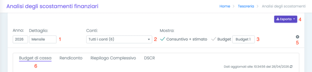 - Filtri temporali (1): cliccando sull’icona del periodo è possibile filtrare la vista del Budget Finanziario per dettaglio temporale (mensile, trimestrale o semestrale) e anno;