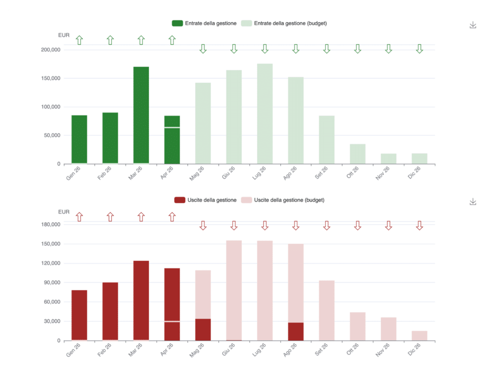 Sono inoltre disponibili due grafici a barre distinti per entrate e uscite. La barra chiara indica il livello del Budget Finanziario, quella più scura il consuntivo. Se il consuntivo è più basso, resta dentro la barra del Budget; se è più alto, la supera e un indicatore visivo segnala il livello originario del Budget.