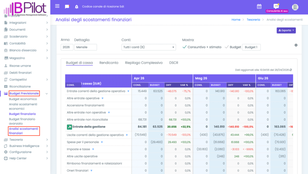 Nella schermata accessibile dal menu laterale Budget Previsionale > Analisi Scostamenti Finanziari, è possibile visualizzare, per ogni periodo, il confronto tra i valori previsti dal Budget Finanziario (BUDGET) e i valori effettivamente realizzati (CONSUNTIVO + STIMATO).