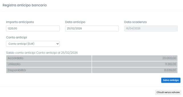 Selezionando in alto a sinistra la voce “Anticipo bancario”, il sistema mostra la schermata dedicata alla registrazione dell’operazione.