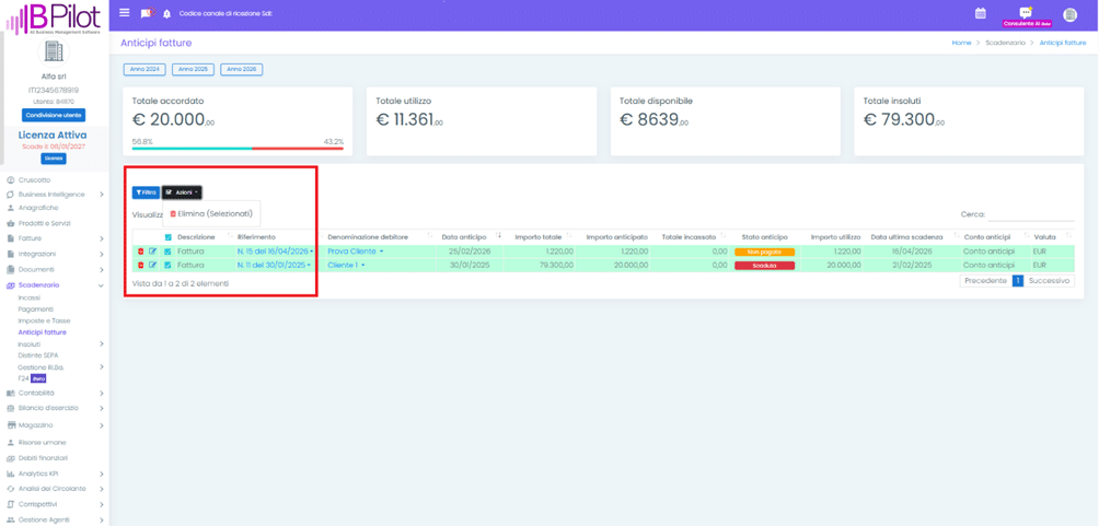 Il sistema genera automaticamente le scadenze future necessarie alla corretta gestione dell’operazione di anticipo. Lo stato dell’anticipo fattura è consultabile nel pannello “Anticipi fatture”, all’interno della sezione “Scadenzario”.