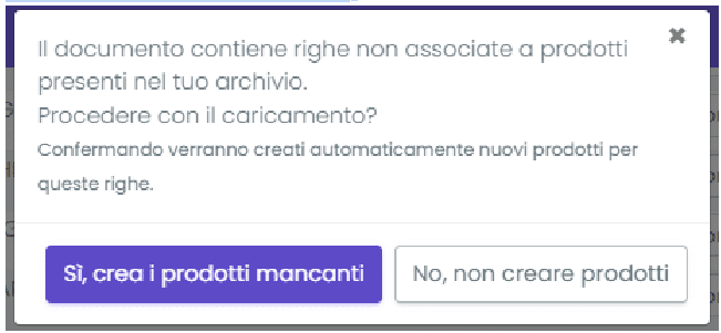 Se non viene effettuata l’associazione per tutti i prodotti presenti nel documento e non viene esplicita la creazione di nuovi prodotti, il sistema mostrerà un messaggio di avviso:
