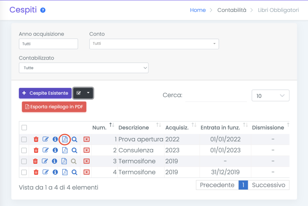 Tramite il tasto Esporta riepilogo in PDF, è possibile esportare il riepilogo sintetico dei cespiti presenti sul sistema. È inoltre possibile esportare il dettaglio di un singolo cespite in PDF cliccando il tasto evidenziato in figura.