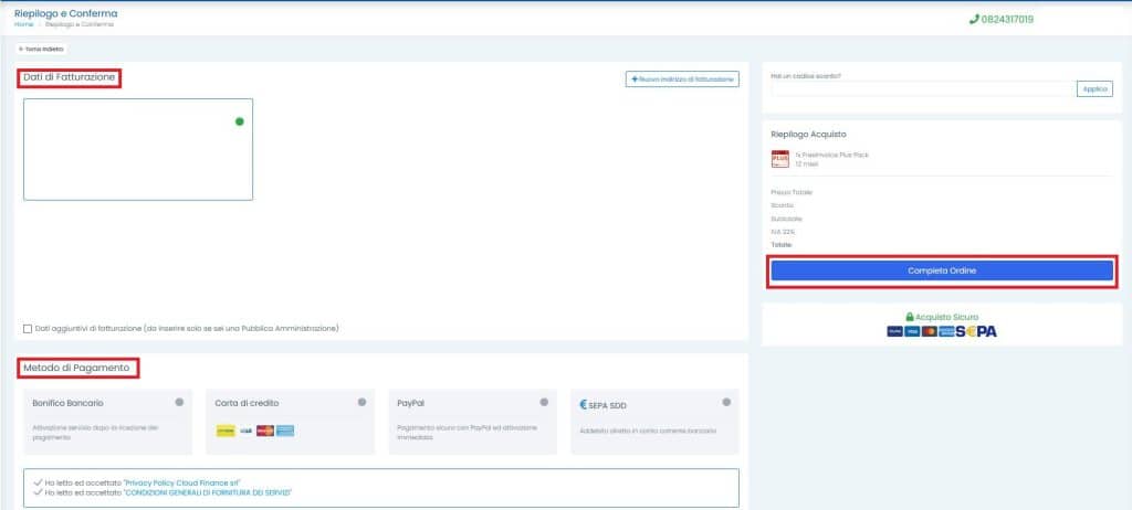 Nella pagina di riepilogo e conferma dell’ordine, inserire i dati per la fatturazione e selezionare il metodo di pagamento desiderato