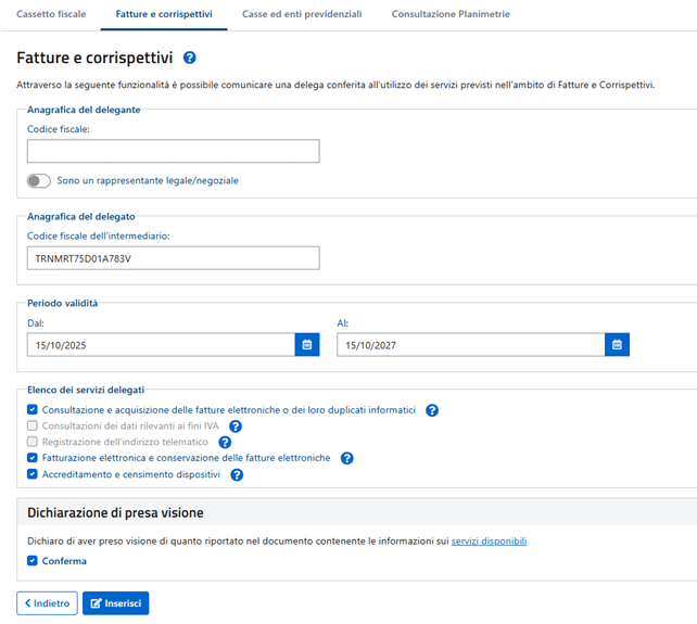 Inserisci il Codice Fiscale :TRNMRT75D01A783V nella sezione “Anagrafica del delegato” e dalla sezione “Elenco dei servizi delegati” spunta le seguenti voci: