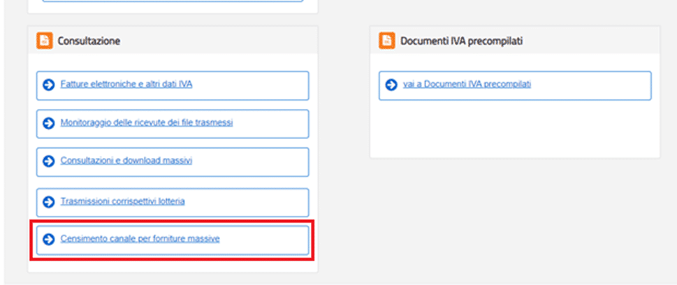 Accedi alla tua area riservata sul portale Fatture e Corrispettivi dell’Agenzia delle Entrate e dal menù dedicato alla Consultazione e clicca su “Censimento canale per forniture massive”