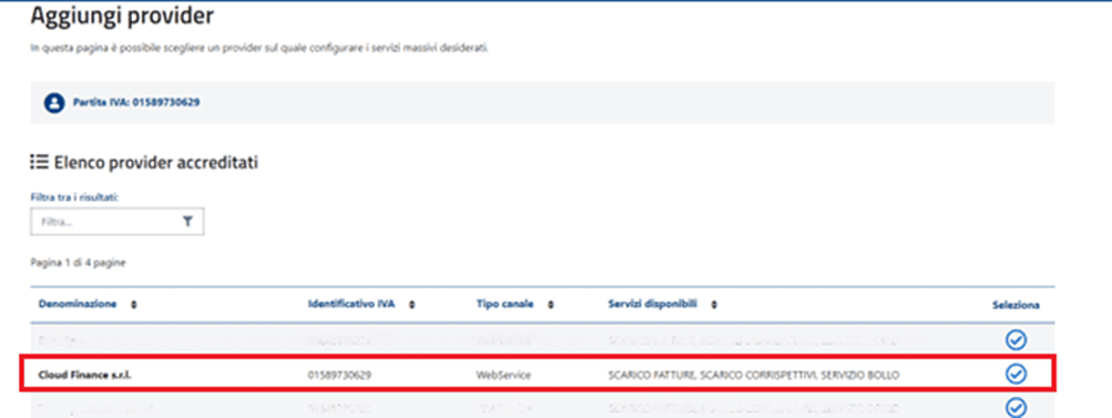 Dalla pagina dedicata ai provider accreditati cerca “Cloud Finance s.r.l.” nell’elenco e clicca sul simbolo Seleziona tutto a destra