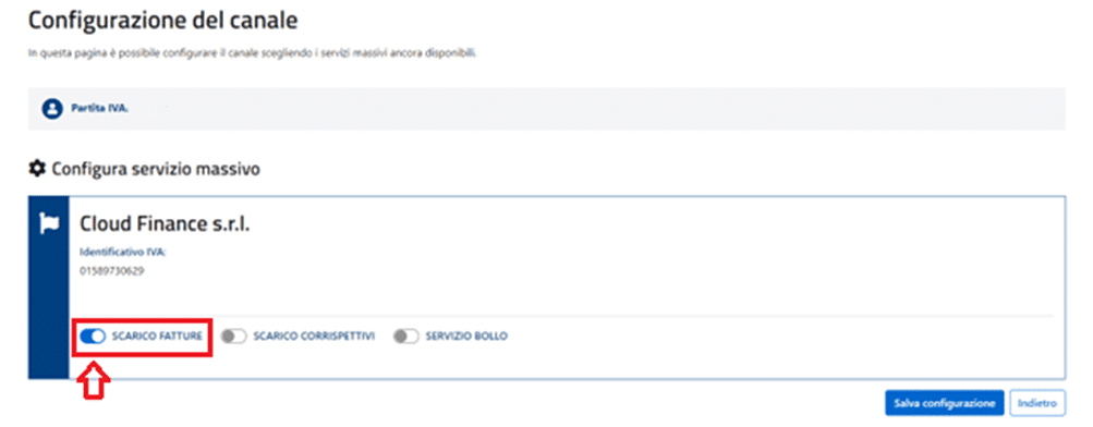 Abilita Cloud Finance s.r.l. al servizio massivo spuntando “SCARICO FATTURE” e clicca su “Salva configurazione”.