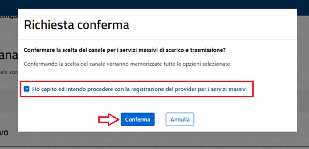 Spunta la casella “Ho capito ed intendo procedere con la registrazione del provider per i servizi massivi” e clicca su Conferma.