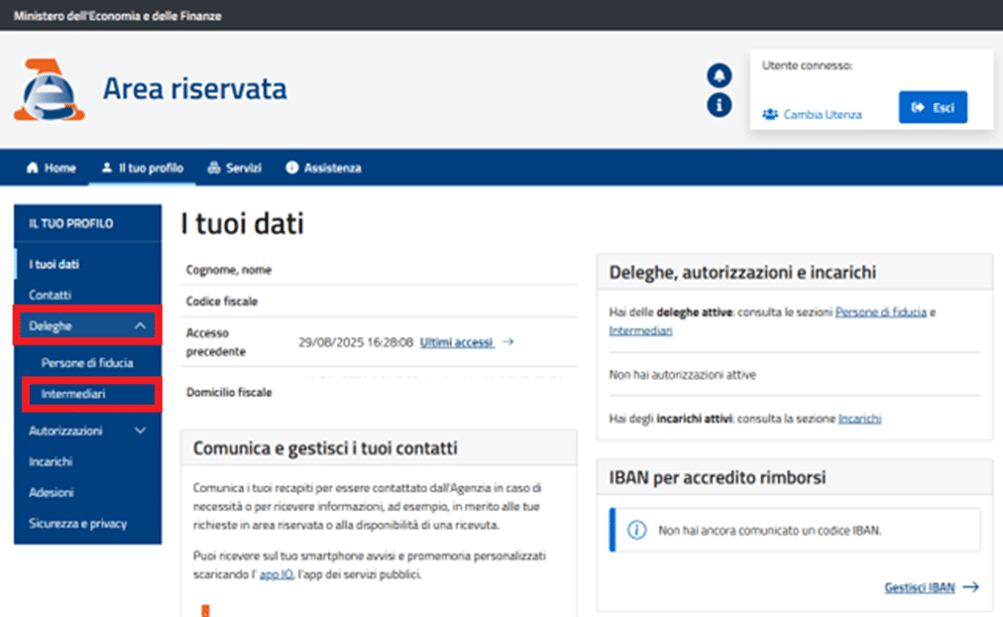 Accedi all’area riservata della tua azienda sul portale dell’Agenzia delle Entrate. Dal menù laterale sinistro clicca su “Il tuo profilo”, “Deleghe” e poi su “Gestisci le tue Deleghe”