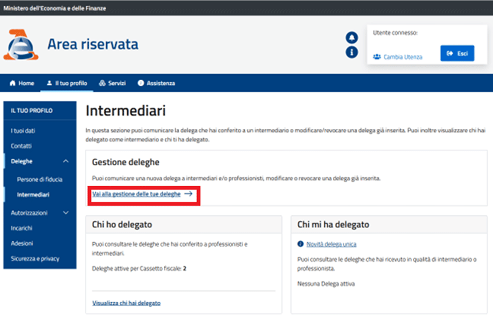 Nella sezione Gestione Deleghe, clicca su: “Vai alla gestione delle tue deleghe”
