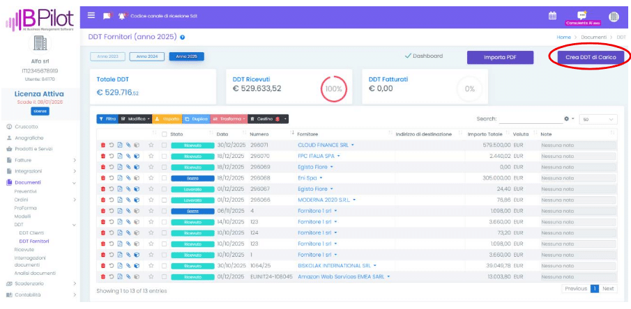 sezione Documenti > DDT > DDT Fornitori, cliccando il pulsante “Crea DDT di Carico”.