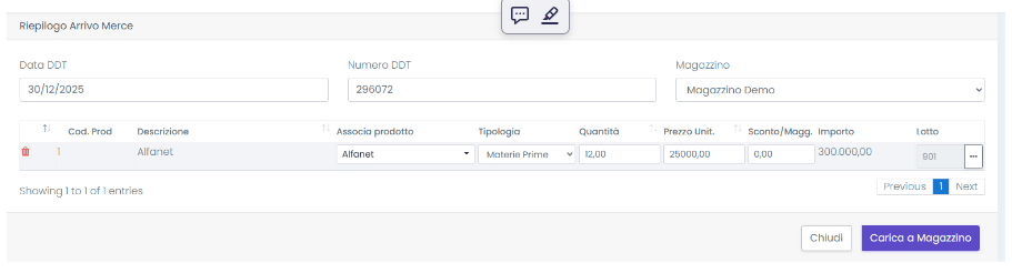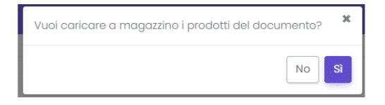 In questo caso viene visualizzato un pop-up che permette di effettuare il carico a magazzino