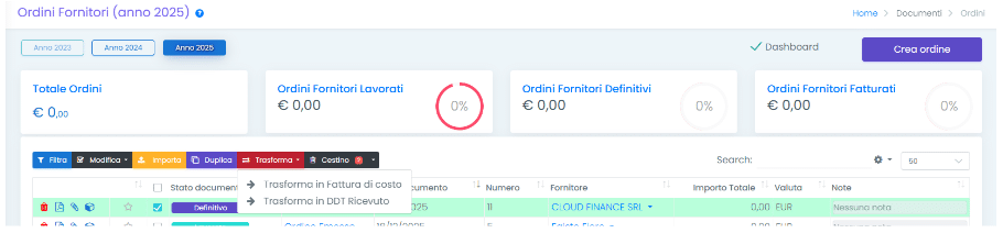 È possibile anche trasformare l’Ordine Fornitore in DDT Fornitore (o Fattura di Costo) tramite il