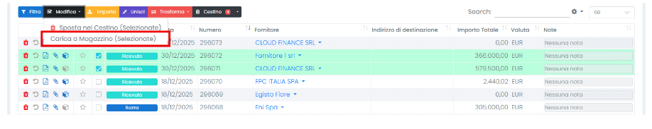 È possibile selezionare più DDT in stato Ricevuto e cliccare Modifica > Carica a Magazzino: