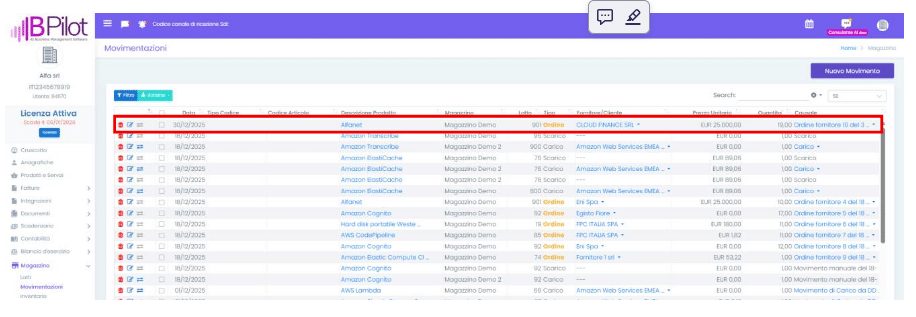 Magazzino > Movimentazioni, viene generata una riga di tipo Ordine: