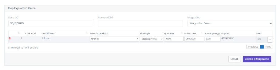 Sarà possibile compilare la modale di Riepilogo Arrivo Merce e confermare il carico.