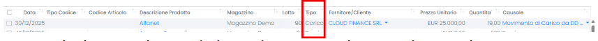 • nella sezione Movimentazioni si genera una riga di Carico con causale