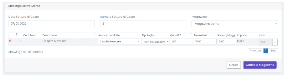 Cliccando il pulsante Arrivo Merce, si aprirà la modale Riepilogo Arrivo Merce, nella quale le