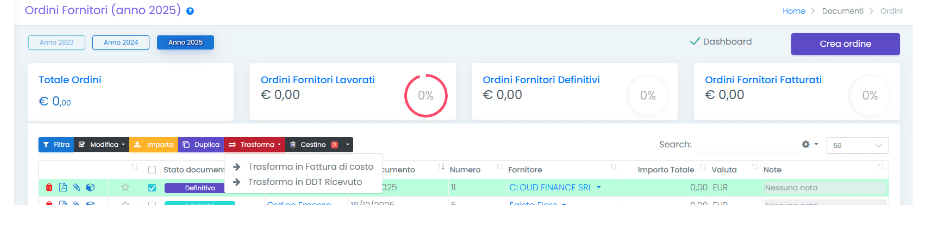 È possibile anche trasformare l’Ordine Fornitore o il DDT Fornitore in Fattura di Costo tramite