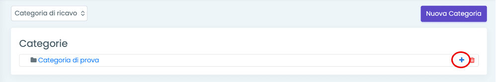 Per creare una sottocategoria, in Configurazione > Generali > Categorie di costo/ricavo, clicca sull’icona “+” di una categoria già presente: