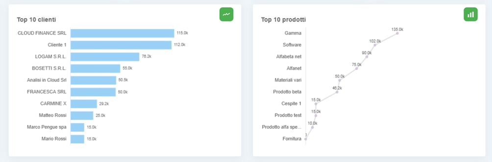 È possibile modificare anche il tipo di grafico mostrato per Top 10 clienti e per Top 10 fornitori: cliccando sull’icona in alto a destra si può convertire il grafico da grafico a barre a grafico a linee.