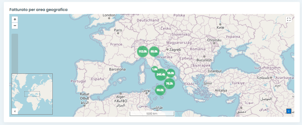 Inoltre, nella dashboard viene presentato il Fatturato per area Geografica grazie ad una cartina geografica interattiva che è possibile ingrandire o ridurre ed aprire e chiudere a schermo intero cliccando sull’icona in alto a destra.