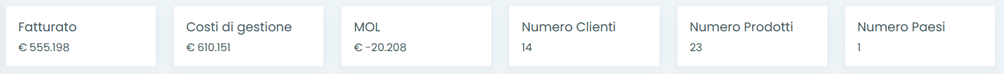 La sezione Dashboard Analytics permette di ottenere una corretta analisi della gestione aziendale ed un monitoraggio in tempo reale. Nella prima sezione è possibile visualizzare nei banner il valore totale di una serie di voci, quali: Fatturato, Costi di Gestione, MOL, Numero Clienti, Numero Prodotti e Numero Paesi in un dato periodo di analisi.
