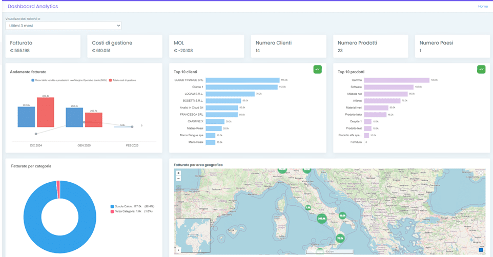 Inoltre, viene rappresentato l’andamento del fatturato (mostrando Ricavi delle vendite e prestazioni, Margine Operativo Lordo e Totale costi di gestione), i Top 10 clienti e Top 10 prodotti in base al fatturato, il fatturato per categoria e per area geografica nel periodo di analisi selezionato.