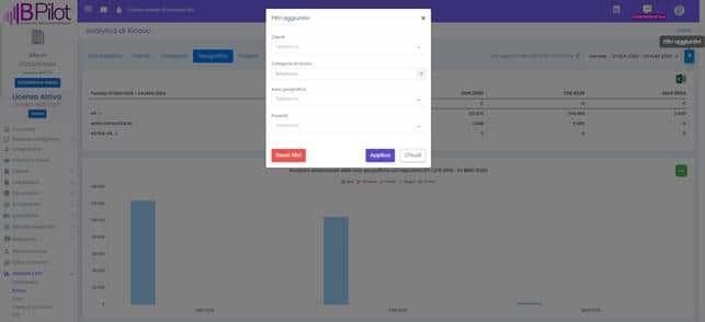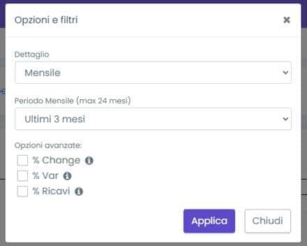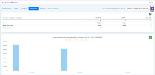 Nelle tab dedicate agli Analytics di ricavo è possibile impostare dei filtri aggiuntivi. Basta cliccare sull’icona rappresentata in figura in alto a destra