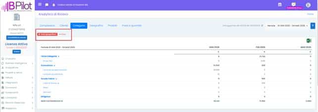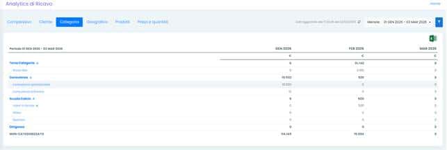 - Analytics andamentale delle prime 5 categorie: mostra l’andamento delle top 5 categorie, ordinate per fatturato, per i diversi periodi di analisi selezionati;
