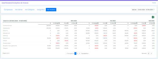 Il seguente tab presenta informazioni relative ai ricavi suddivisi per prodotti, i quali sono ordinati in base al fatturato del periodo di analisi selezionato.