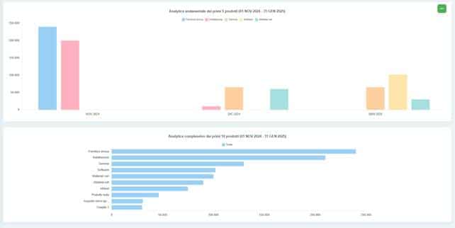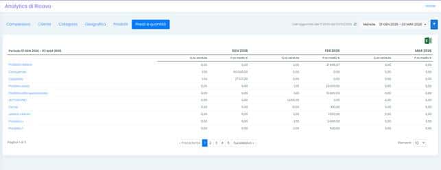 - Analytics andamentale dei primi 5 prodotti: mostra l’andamento dei top 5 prodotti, ordinati per fatturato, per i diversi periodi di analisi selezionati;