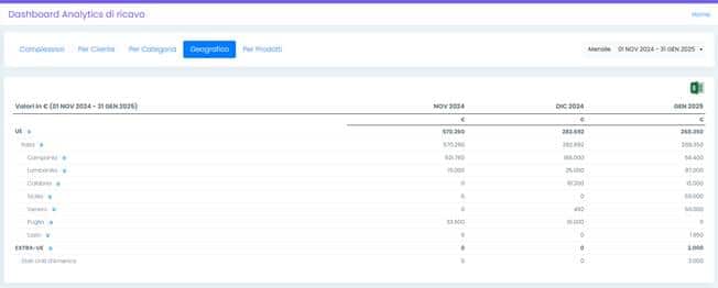 Il seguente tab presenta informazioni relative ai ricavi suddivisi per area geografica, ordinati in base al fatturato del periodo di analisi selezionato. Nello specifico, come mostrato nella figura seguente, il valore dei ricavi per area geografica vengono suddivisi in UE ed EXTRA UE, indicando le nazionalità che sono valorizzate, ossia quelle nelle quali sono stati venduti i prodotti o servizi. In particolare, per l’Italia è possibile ottenere un dettaglio sia per regione che per singola provincia.