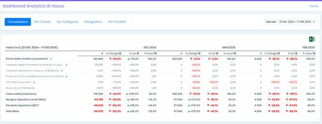 à Ad esempio, se a gennaio 2024 il dato è pari a € 150 e a gennaio 2025 è pari a € 120, allora % variazione sarà pari al -20,0%; - % Ricavi: rappresenta l’incidenza percentuale