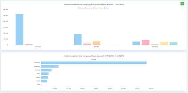 - Analytics andamentale delle aree geografiche più importanti: mostra l’andamento delle top 5 aree geografiche, ordinate per fatturato, per i diversi periodi di analisi selezionati;