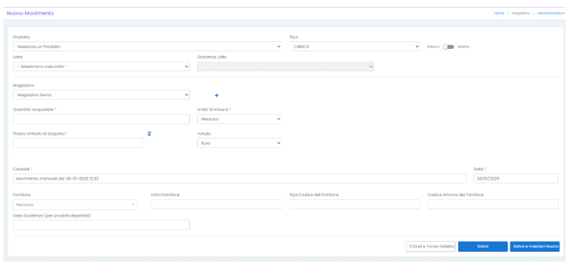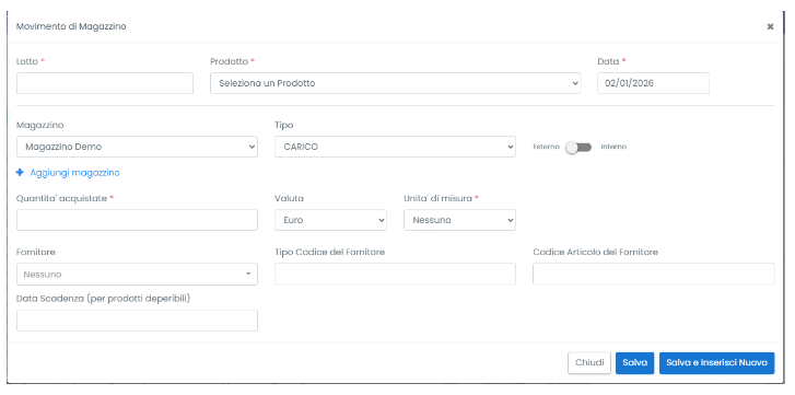 Cliccando su “Nuovo Movimento” si apre la seguente schermata per inserire un carico o scarico manualmente