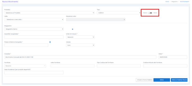 Inoltre, vi è la possibilità di selezionare se si tratta di un movimento ‘Esterno’ o ‘Interno’. Col primo caso si movimentano beni effettivamente acquistati/venduti; nel secondo caso, si può caricare un bene generato/prodotto internamente o scaricare un bene consumato/utilizzato internamente.