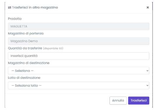 Indicando le quantità da trasferire, il magazzino di destinazione e il lotto di destinazione e confermando, verrà effettuato il trasferimento.