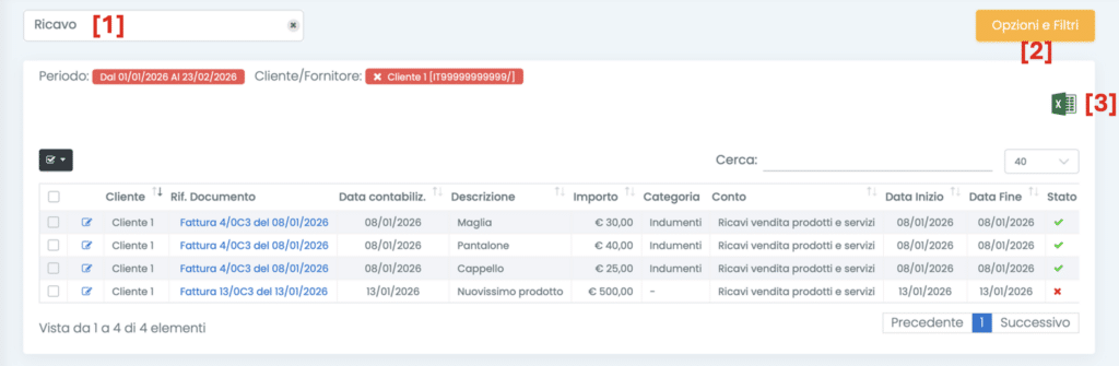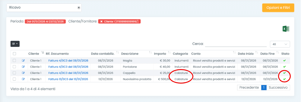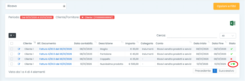 2. Filtrare le righe in base ai clienti/fornitori, alle categorie di costo/ricavo e al periodo di riferimento, cliccando il tasto Opzioni e filtri;