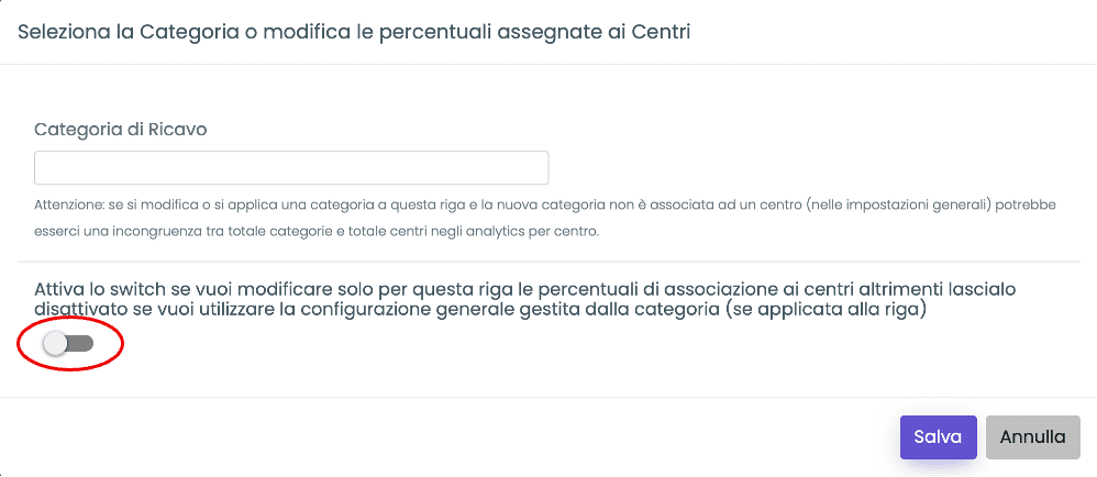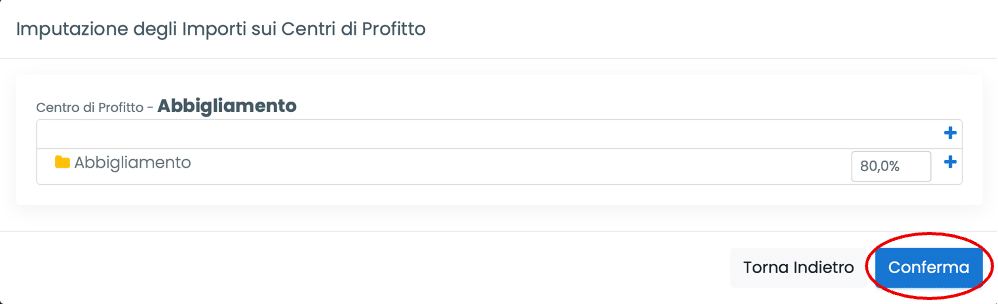 • Definisci la percentuale di associazione della riga al centro di profitto desiderato; clicca Conferma e poi Salva: