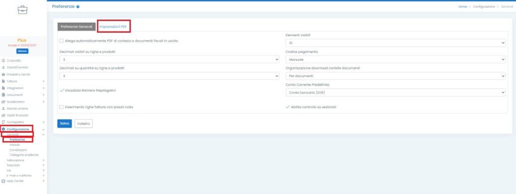 Per selezionare il Template, apri il menù laterale sinistro e vai in Configurazione → Generali → Preferenze e accedere alla sezione Impostazioni PDF.