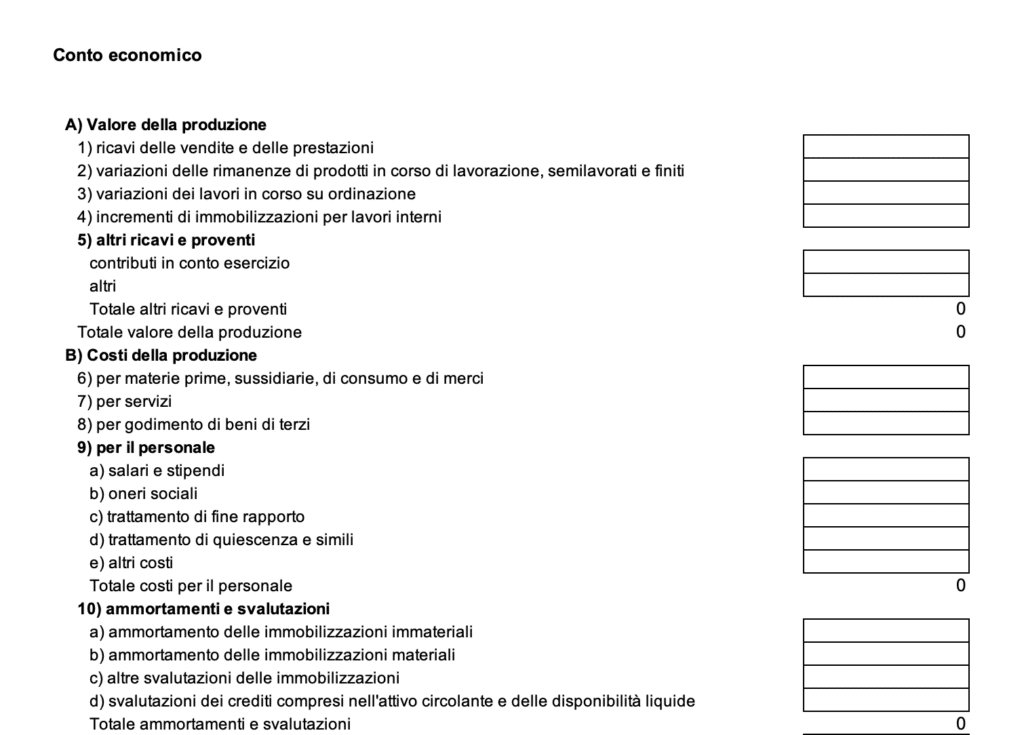 - Incidenza dei costi (6): è disponibile una tabella denominata Incidenza dei costi in cui inserire, per ciascuna voce di costo, l’incidenza percentuale sui ricavi, intesa come rapporto tra il valore della voce di costo e i ricavi complessivi.