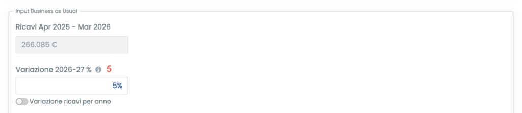 - Tasso di variazione dei ricavi (5): definisce la variazione percentuale attesa dei ricavi nel periodo di previsione rispetto alla base dati di riferimento selezionata (ad esempio aprile 2025 – marzo 2026). Il parametro consente di simulare scenari di crescita (es. espansione commerciale) o contrazione del fatturato, mantenendo come riferimento i dati storici.