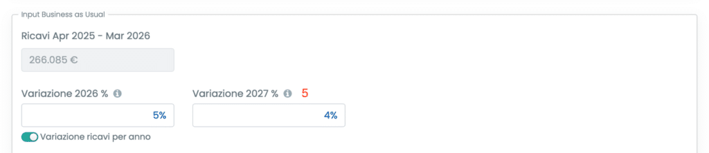 È inoltre disponibile lo switch Variazione ricavi per anno, che consente di specificare una percentuale di variazione distinta per ciascun anno incluso nel periodo di previsione (nel caso in esame, poiché la previsione ha durata 12 mesi e decorre da aprile 2026, è possibile definire separatamente il tasso di variazione per il 2026 e per il 2027).