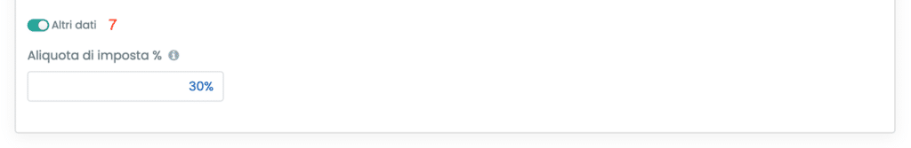 - Aliquota di imposta (7): subordinato allo switch Altri dati, è presente il campo per l’inserimento dell’aliquota complessiva per il calcolo delle imposte sul reddito. Si consiglia di stimare la percentuale considerando l’incidenza complessiva delle imposte, includendo sia IRES sia IRAP, al fine di ottenere una stima più aderente al carico fiscale effettivo;