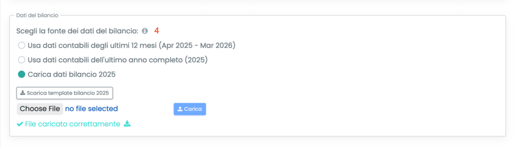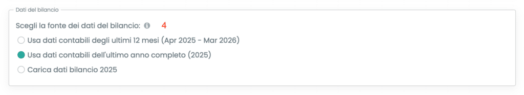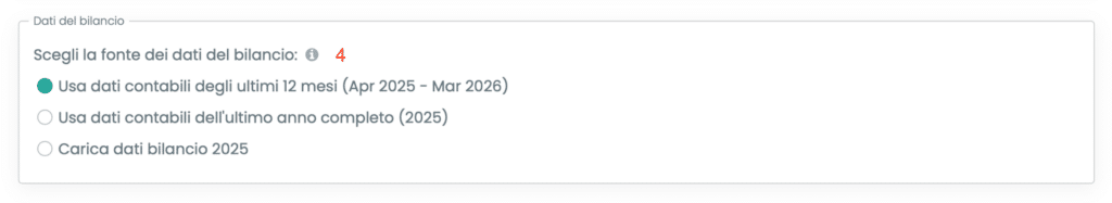 - Dati contabili dell’ultimo anno completo: il Budget economico si basa sui dati contabili dell’anno completo immediatamente precedente all’anno di inizio della previsione, se presenti sul gestionale BPilot. Ad esempio, se il mese di inizio della previsione è aprile 2026 (e quindi l’anno di inizio è il 2026), il set di dati di riferimento corrisponderà ai dati BPilot relativi all’anno 2025. Questa opzione è consigliata se l’obiettivo è quello di utilizzare dati maggiormente assestati e riferiti a un anno già concluso (approccio più conservativo);