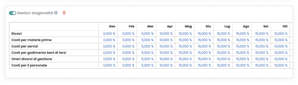 - Gestione della stagionalità (8): consente di definire la distribuzione mensile dei ricavi e delle principali voci di costo lungo l’orizzonte temporale del Budget Economico. Questa funzionalità è particolarmente utile per imprese caratterizzate da stagionalità marcata, in cui ricavi e costi si concentrano in specifici periodi dell’anno (ad esempio, da marzo a ottobre).