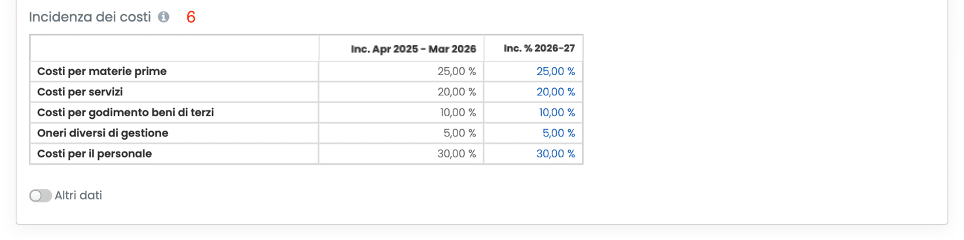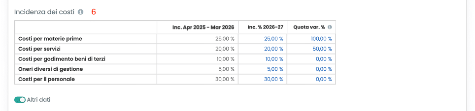 Tramite lo switch Altri dati è inoltre possibile specificare, per ciascuna voce, la quota variabile del costo, ovvero la componente legata all’andamento dei ricavi: un valore pari al 100% indica un costo interamente variabile (proporzionale ai ricavi), mentre un valore pari allo 0% indica un costo interamente fisso.